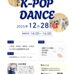 2025年11月16日 / 最終更新日時 : 2025年11月16日 admin イベント 【12月28日開催】1日限定K-POPダンス教室 好評につき、再びダンス講座を開催!今回のテーマは「K-POP」でダンス!もちろん、ダンス初心者も大歓迎♪ 〇活動日時 12月28日(日) 14:00~16:00 〇対象 小学生~大学・専門学生 (小学生は保護者同伴必須) […]