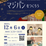 2025年10月27日 / 最終更新日時 : 2025年10月31日 admin イベント 【12月6日開催】お菓子づくりがもっと楽しくなる!マジパン細工づくり ケーキや焼き菓子のデコレーションにもつかわれている”マジパン”を作ります♪プロのパティシエに教わることができるチャンス!! 先生特製のショートケーキのデコレーションにも挑戦できるよ。ケーキが食べたい人もぜひ参加してね🍰✨ […]